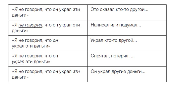 Пример. Рассмотрим, что домыслит слушатель, если говорящий будет по-разному расставлять акценты в одной и той же фразе: «Я не говорил, что он украл эти деньги».