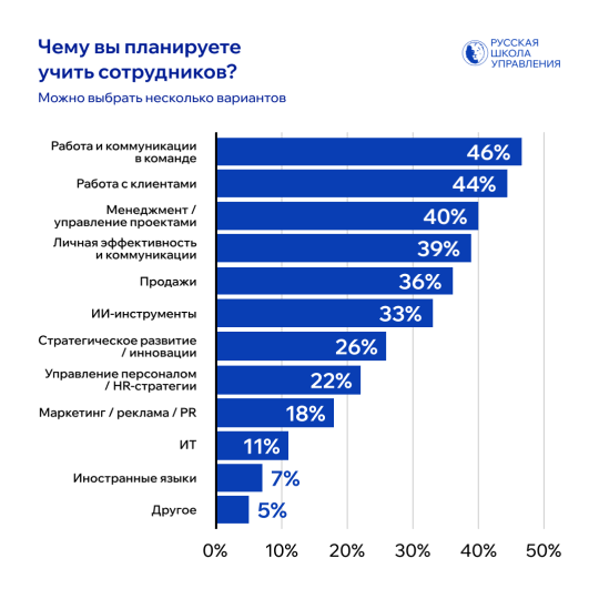 Данные опроса показывают, что большинство компаний системно подходят к развитию персонала: 53% планируют обучать сотрудников всех уровней. Остальные выбирают более точечный подход: 45% будут развивать линейных специалистов, 38% — руководителей подразделений, 11% — топ-менеджеров.